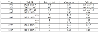 Copper mineralization on the property was first discovered in 1969, while following up on anomalous stream sediment samples. The following year Falconbridge Ltd. optioned the property and over the next two years completed IP and magnetic surveys, geological mapping, soil sampling and diamond drilling. This work identified the A Zone with intersections in drilling up to 0.84% copper over 45.7 metres (DDH-1971-13) and 0.70% copper over 51.8 metres (DDH-1971-20).