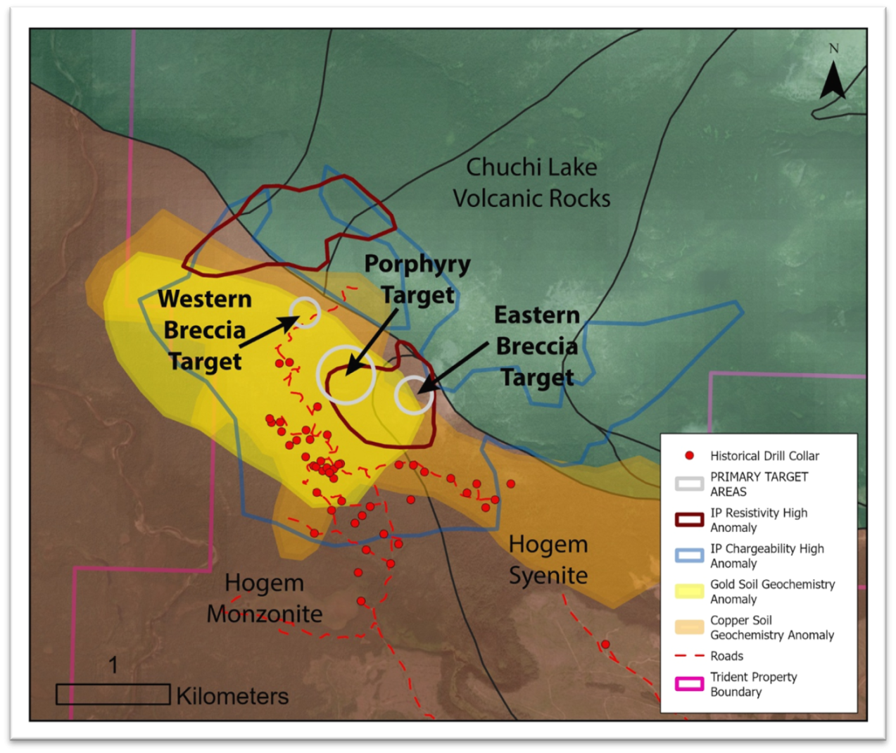 Figure 2 - Compilation map of the Trident property showing multiple independent datasets converging on a major discovery opportunity. A large porphyry target is outlined by copper and gold soil anomalies, resistivity and chargeability features, and favorable intrusive–volcanic contacts. Flanking this centre, conductivity highs define undrilled breccia targets supported by strong copper geochemistry. Together, the data outline a system-scale copper-gold target that has never been tested.