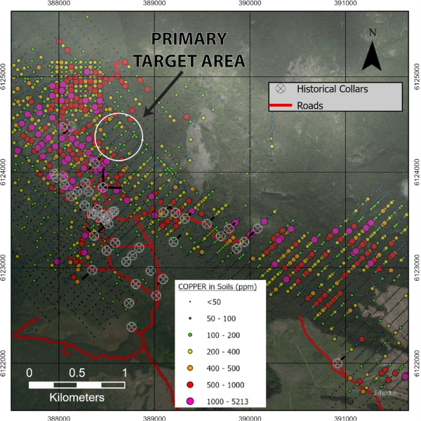 Figure 3 - Copper soil geochemistry in relation to the Primary Target.