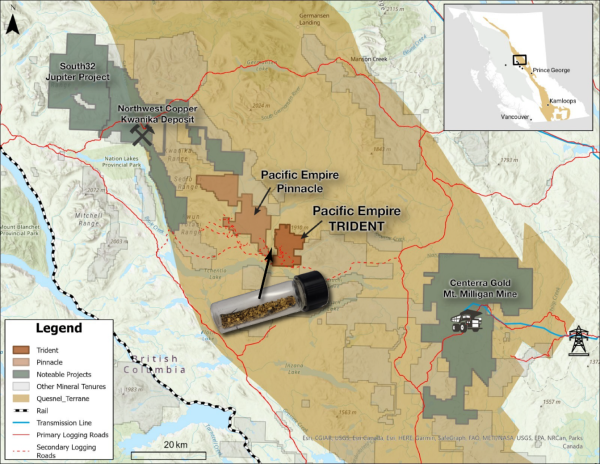 “Between our 100% owned Trident and Pinnacle projects runs the Klawli river. The gold flakes and nuggets in the vial displayed on the map were collected from that location on the Klawli river. It is this and other geochemical evidence gathered by the PEMC exploration team which leads us to postulate the potential for a gold-enriched copper system nearby on either Trident, Pinnacle, or possibly both projects. To date, visible gold has been observed in outcrops at Trident, placer gold discovered in the nearby Klawli river gravels, as well gold has been detected in drill core from Pinnacle. All three of these known occurrences of gold and their respective locations suggests there may be a shallow buried, large scale, gold-enriched, copper porphyry deposit within our district scale land package,” commented Brad Peters, President, CEO and Director of Pacific Empire.