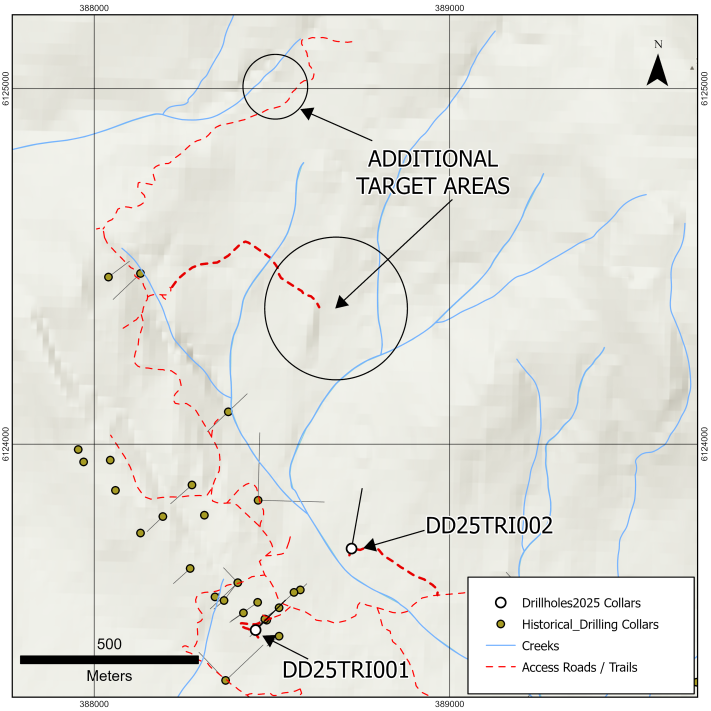 The first diamond drill hole (DD25TRI001) has now been completed to a depth of 503 metres. This drillhole was intended to follow up on historical drilling conducted in 2007, which intersected copper mineralization associated with discrete porphyry dikes.