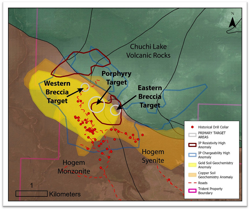 Figure 2 - Compilation map of the Trident property showing multiple independent datasets converging on a major discovery opportunity. A large porphyry target is outlined by copper and gold soil anomalies, resistivity and chargeability features, and favorable intrusive–volcanic contacts. Flanking this centre, conductivity highs define undrilled breccia targets supported by strong copper geochemistry. Together, the data outline a system-scale copper-gold target that has never been tested.
