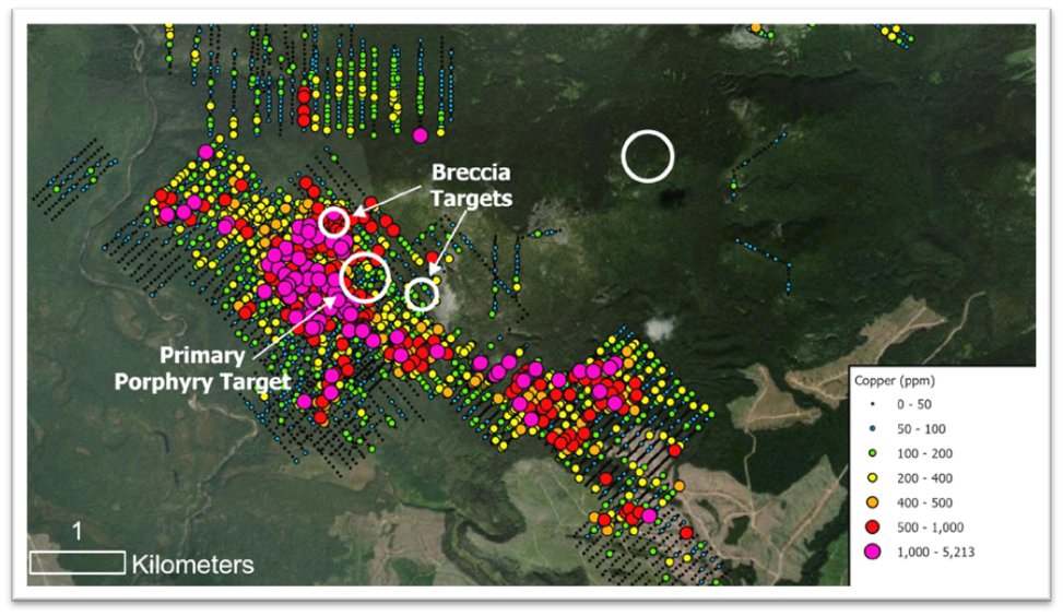 Figure 3 - A highly anomalous copper-in-soil anomaly defines the primary porphyry target at Trident. On a moderate slope, the source of the anomaly is most likely located near its upper extent — precisely where drilling is planned. This anomaly, combined with supporting geophysics and geology, makes Trident one of the most exciting undrilled porphyry copper-gold targets in British Columbia.